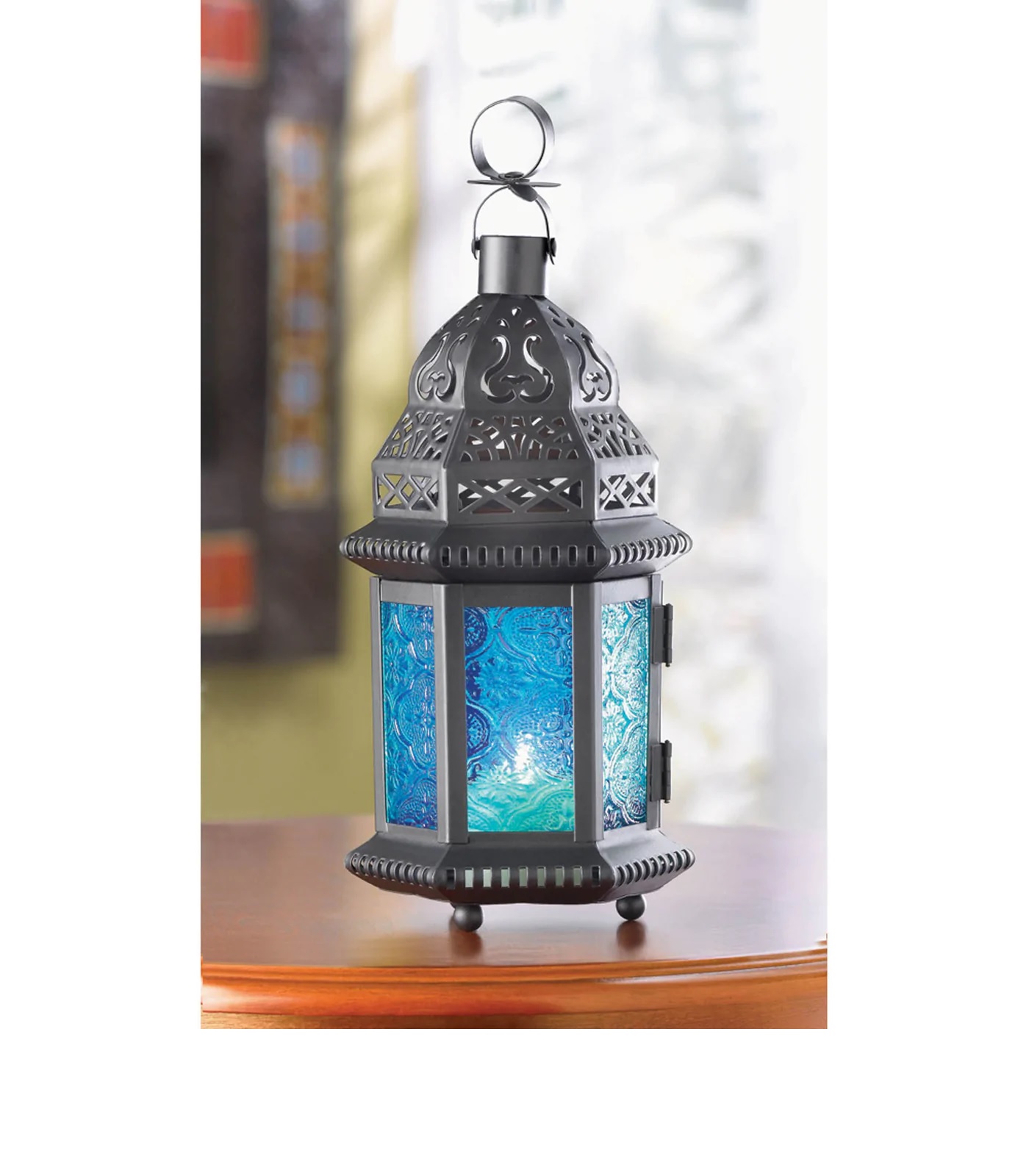 Illuminate your space with the exotic charm of our Blue Glass Candle Moroccan Lantern. This stunning lantern features intricate metalwork and vibrant blue glass panels that create a mesmerizing ambiance when lit. Perfect for adding a touch of bohemian flair to any room, this lantern is ideal for both indoor and outdoor use. Whether used as a centerpiece on a dining table or hung from a hook in your garden, this lantern will bring a touch of Moroccan-inspired elegance to your decor. Light up your space in style with our Blue Glass Candle Moroccan Lantern today!