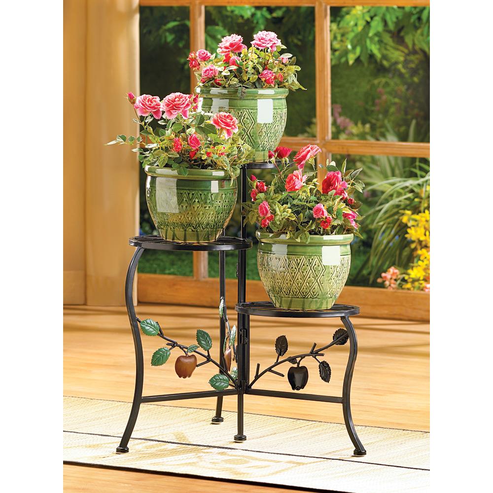 • Put your favorite plants on proud display with this country-style stand! An apple-branch motif adds charm and color to a graceful triple-tier 'gate' design.