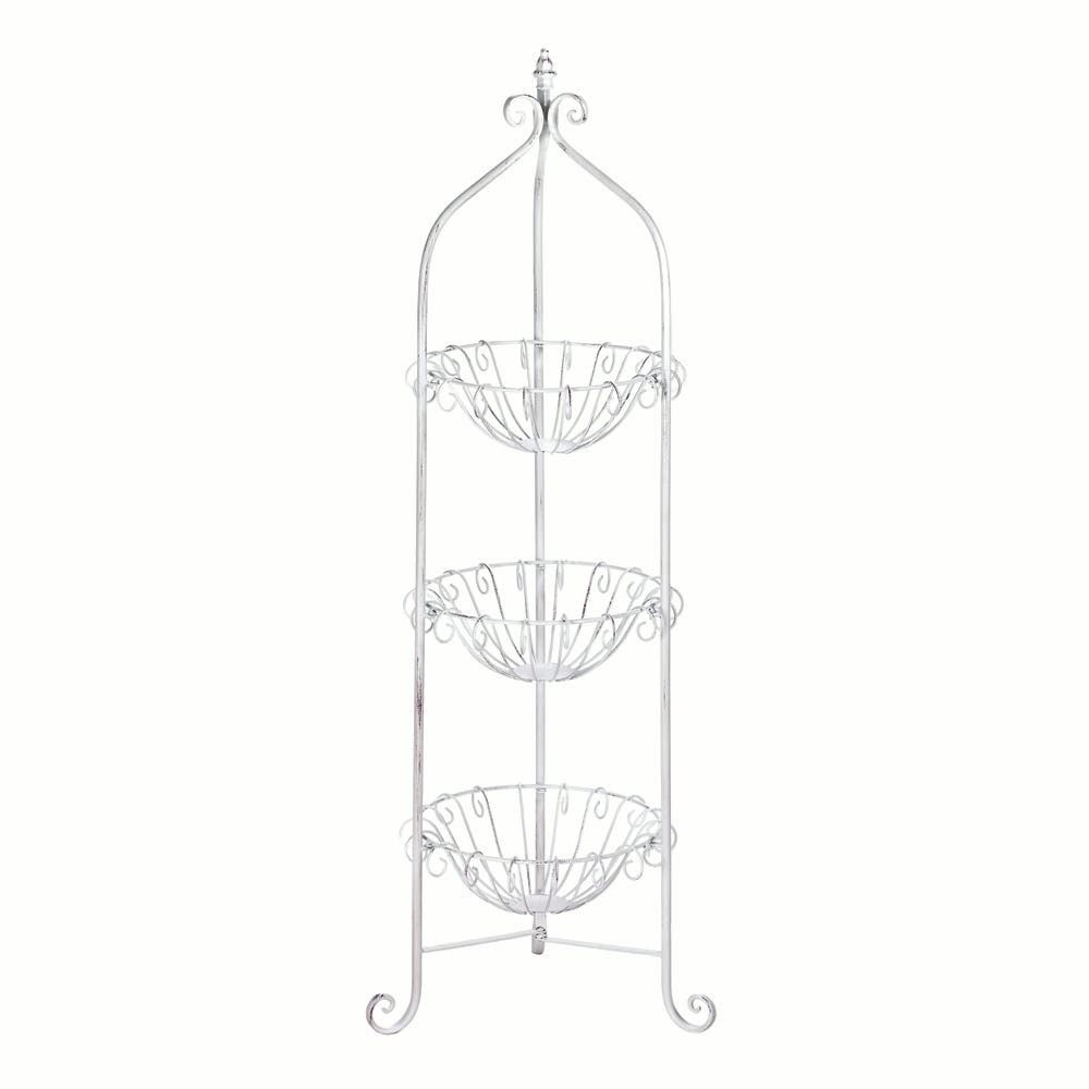 • Three curled metal wire baskets stand in a metal frame, complete with curled feet and a finial on top. Fill it with three of your favorite plants or blooms, or let your imagination fill these baskets with whatever you'd like to display.