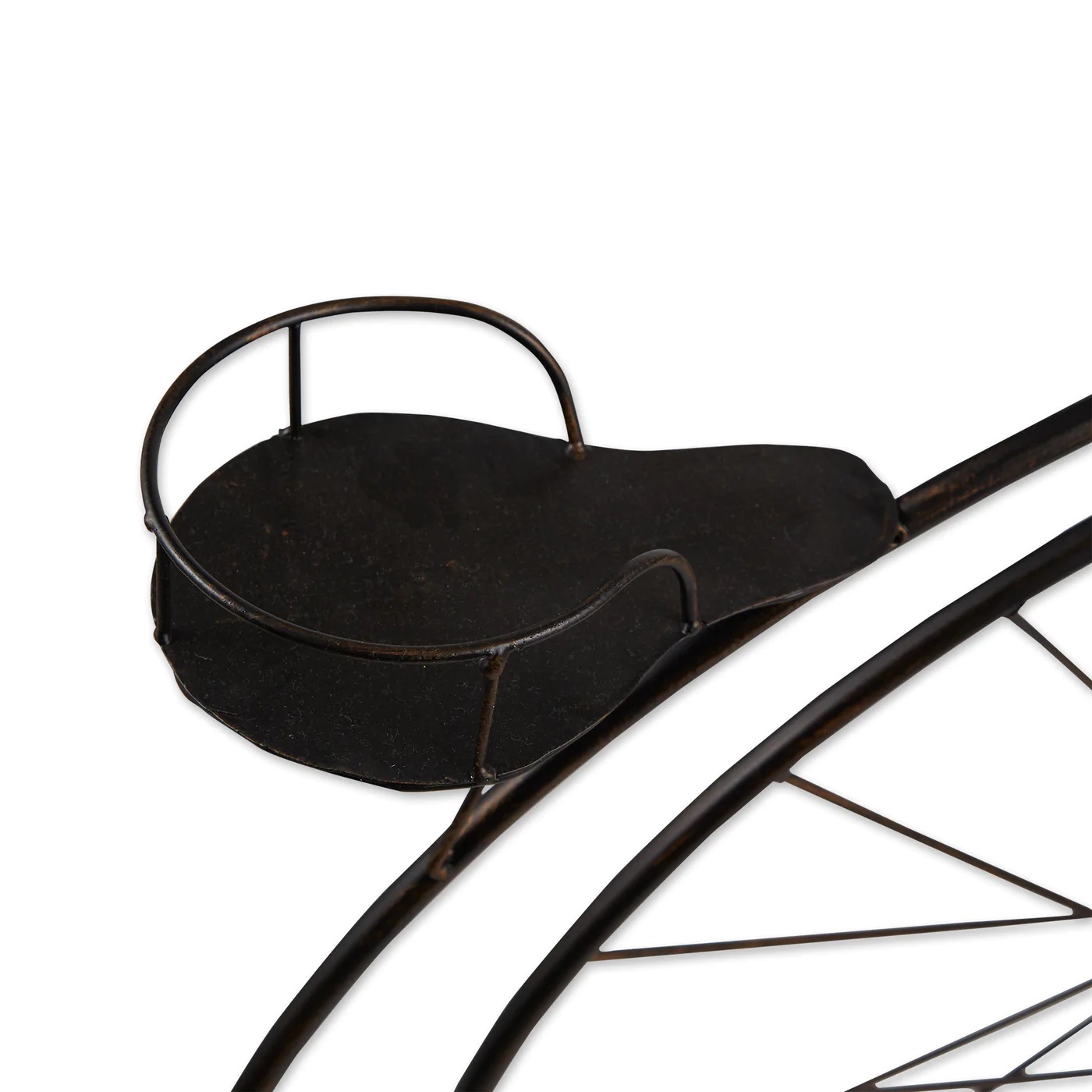 • This adorable planter's frame looks like a high-wheel bicycle from bygone days, with one large wheel in the front and a smaller wheel in back. Attached are three pails that are ready to hold your blooming plants. This lovely accessory will look great on your patio or in your favorite room.