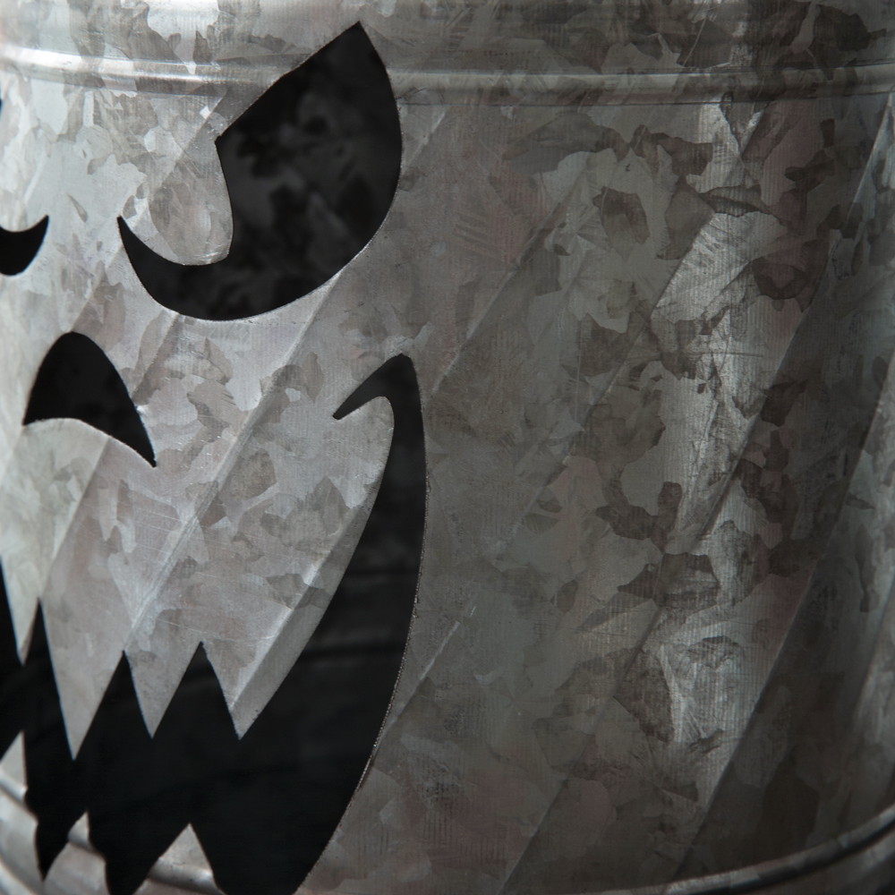 Spooky, scary, scarecrow! Illuminate the steps of a porch on a ghoulish Halloween night. Luminary is made of galvanized metal with rusty accents. Insert a candle through its access door in the back. Item is 14½''H with handle extended.