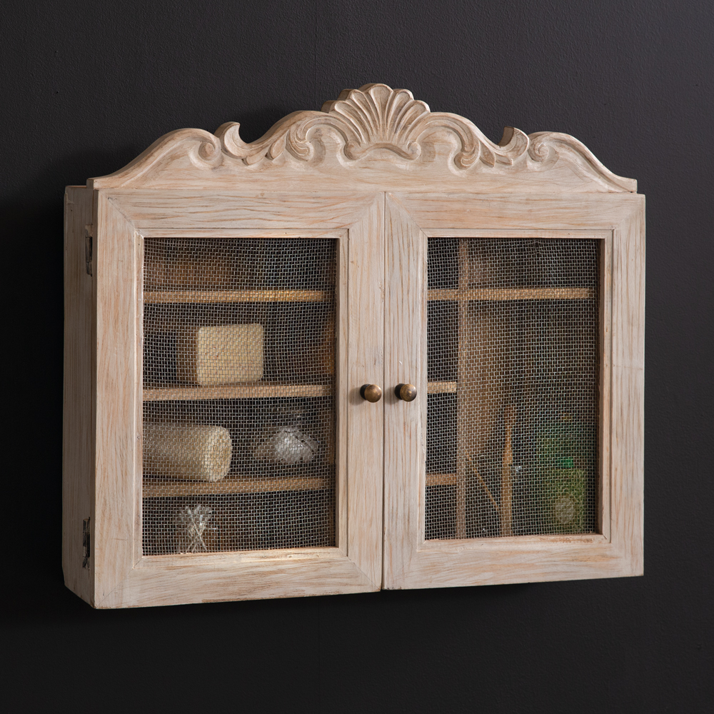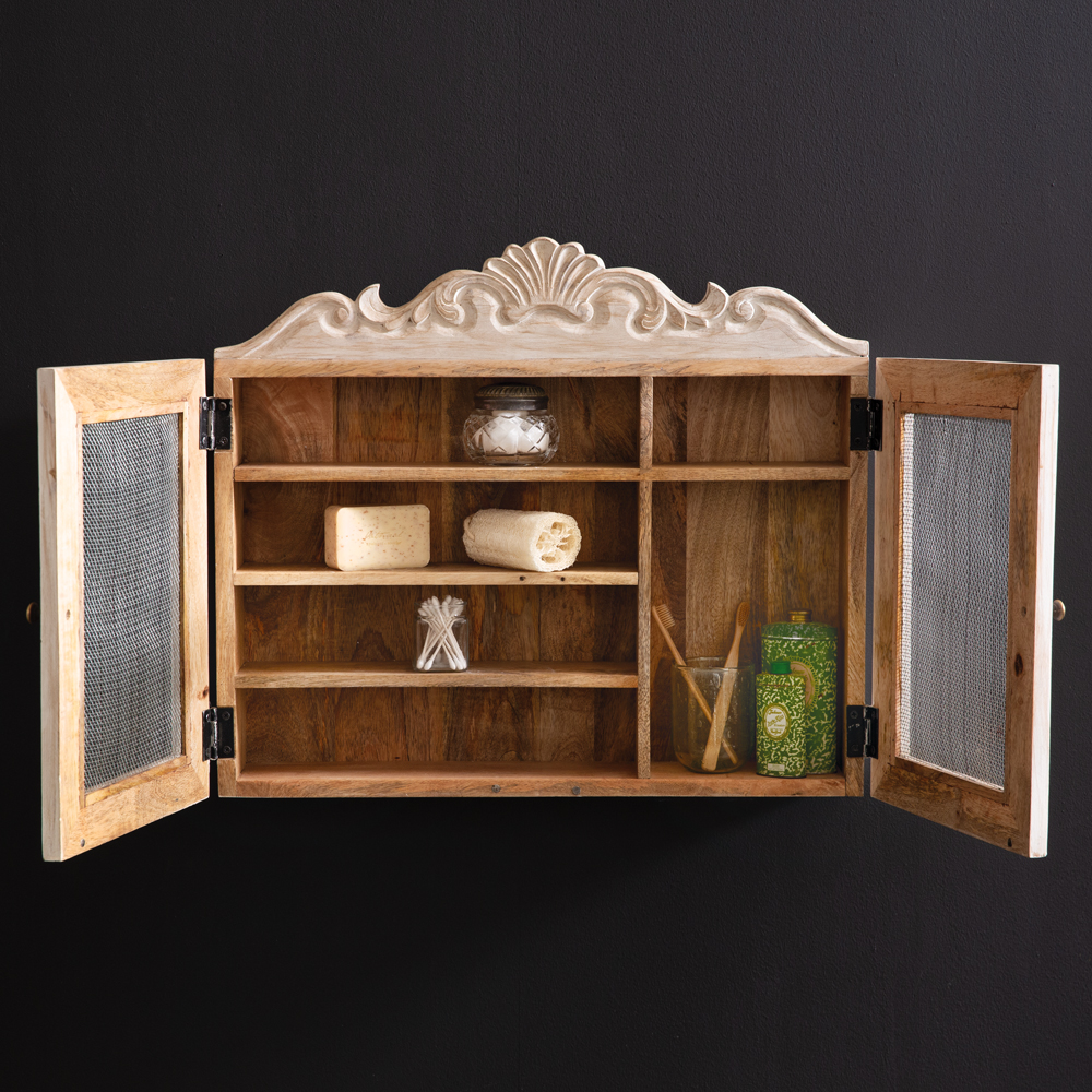 Create a space for toiletries, medicine, or spices with our wall cabinet. Crafted from solid mango wood, this piece features antique brass knobs, wire mesh cabinet doors, and an intricate filigree carving. Real wood is a product of nature, and as such, no two pieces are alike. Variations in grain, patterns, and color are to be expected and help create a beautiful and unique one-of-a-kind piece. To hang, use its two D-ring hangers.